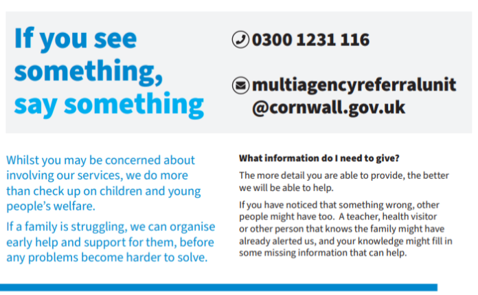 If, at any time, you are concerned about the safety and welfare of any child, then please contact Nanpean School on 01726 822447, and ask to speak to any of the named persons below. However, if you have a concern out of school hours please use the phone number for the Multi-Agency Referral Unit which is 0300 1231 116.